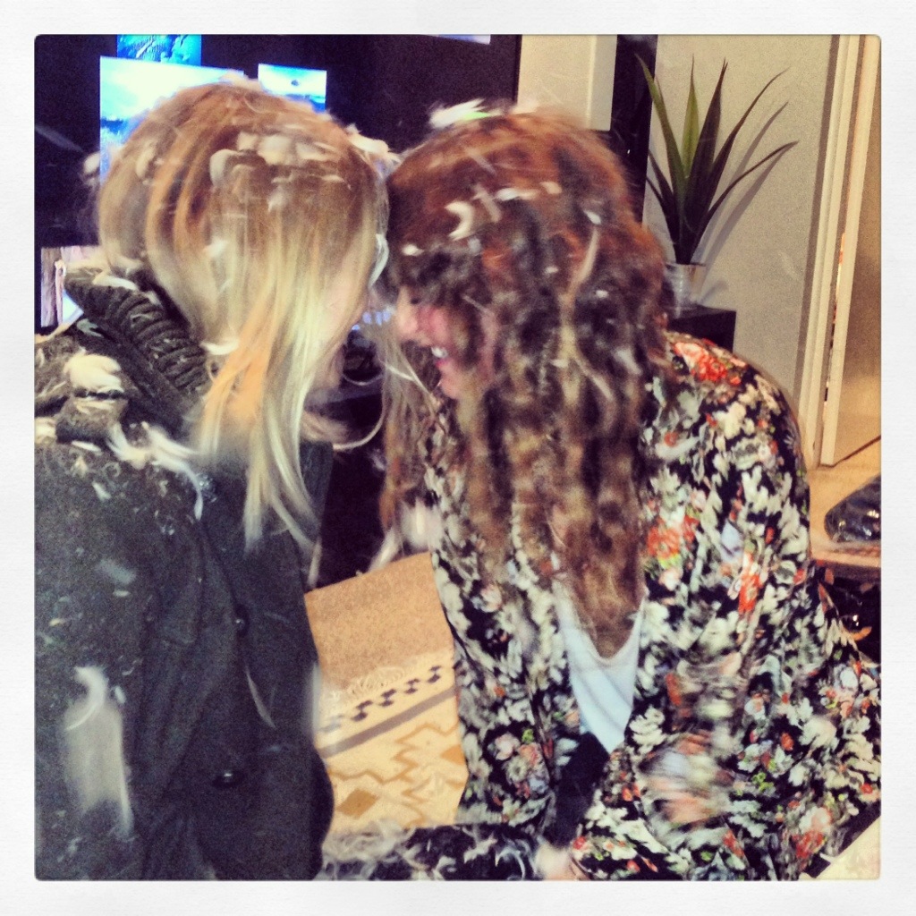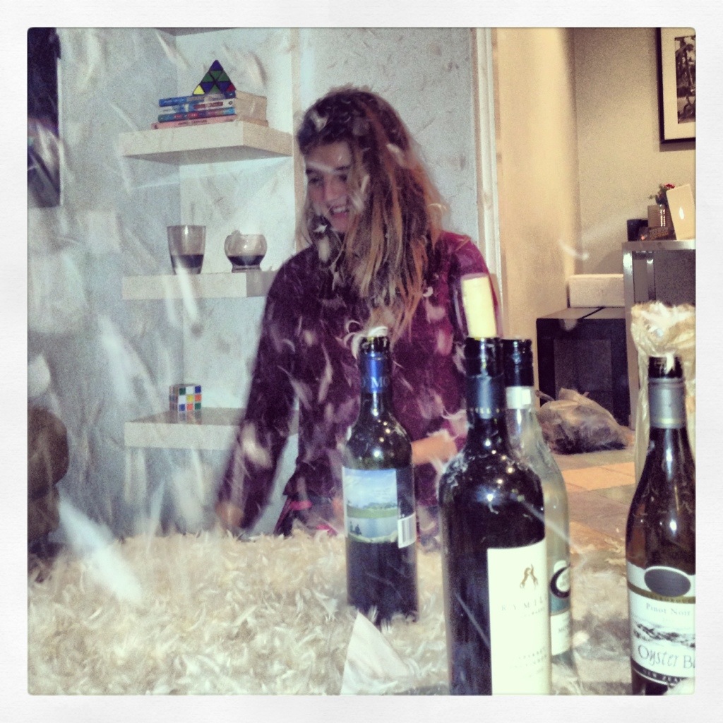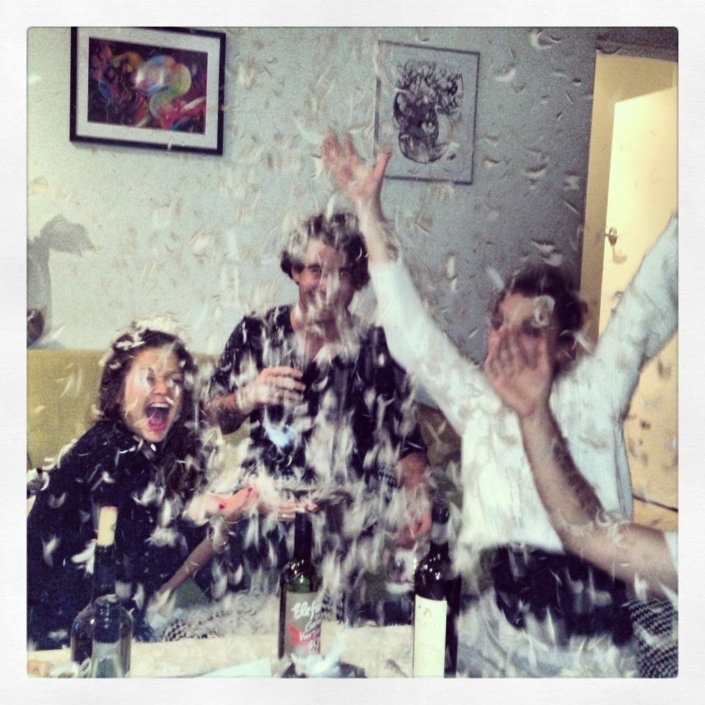 On Saturday night, at a friends house, we decided to rip open a pillow and make it rain. Literally rain. With soft white beautiful little feathers. It was like heaven for drunks. We are geniuses.